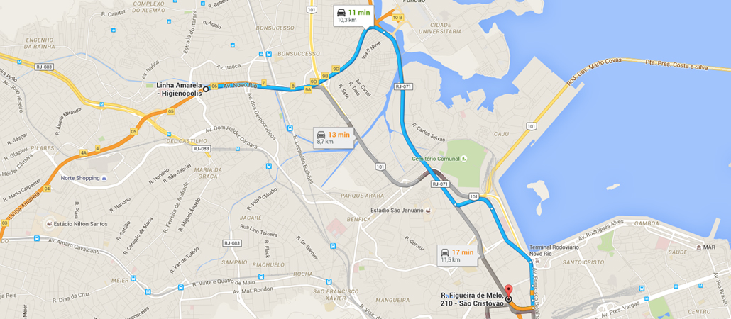 – Siga pela Linha Amarela, sentido Ilha do Fundão, e acesse a saída 10ª em direção a Centro / Copacabana;